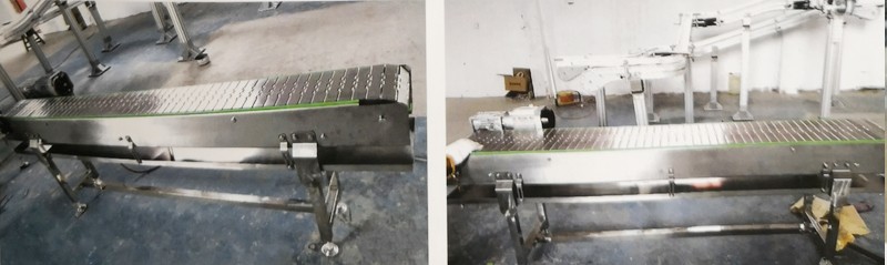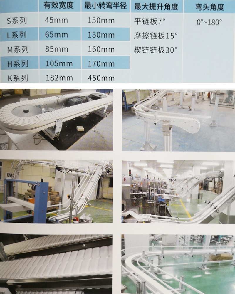 該輸送機使用POM鏈板,表面光滑,摩擦力小,機身有碳鋼和不銹鋼,能滿足各行業(yè)不同需求。便于清潔,-般都可以直接沖洗。設(shè)備結(jié)構(gòu)簡單,維護方便。鏈條寬度從82.6mm至304. smm等多種規(guī)格,最小轉(zhuǎn)彎半徑200mm。